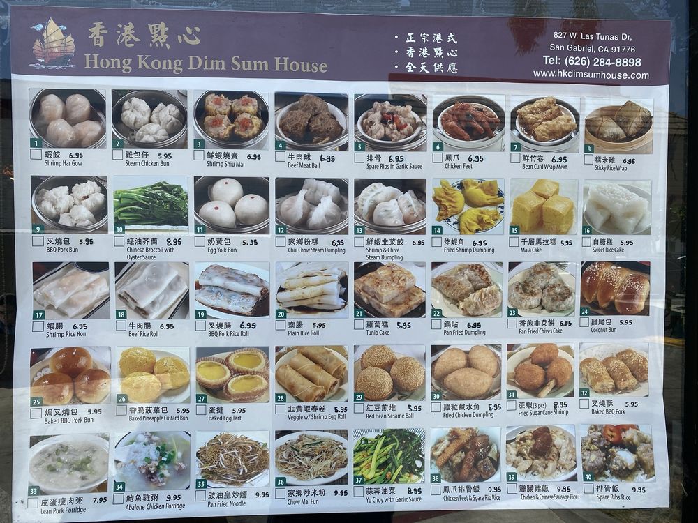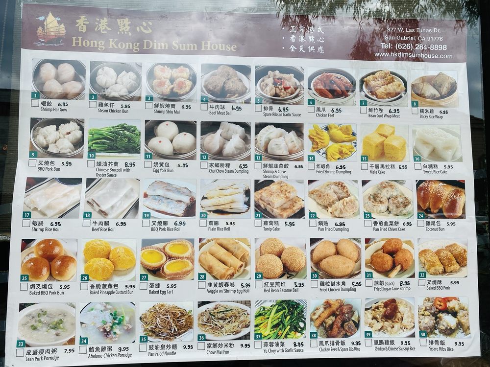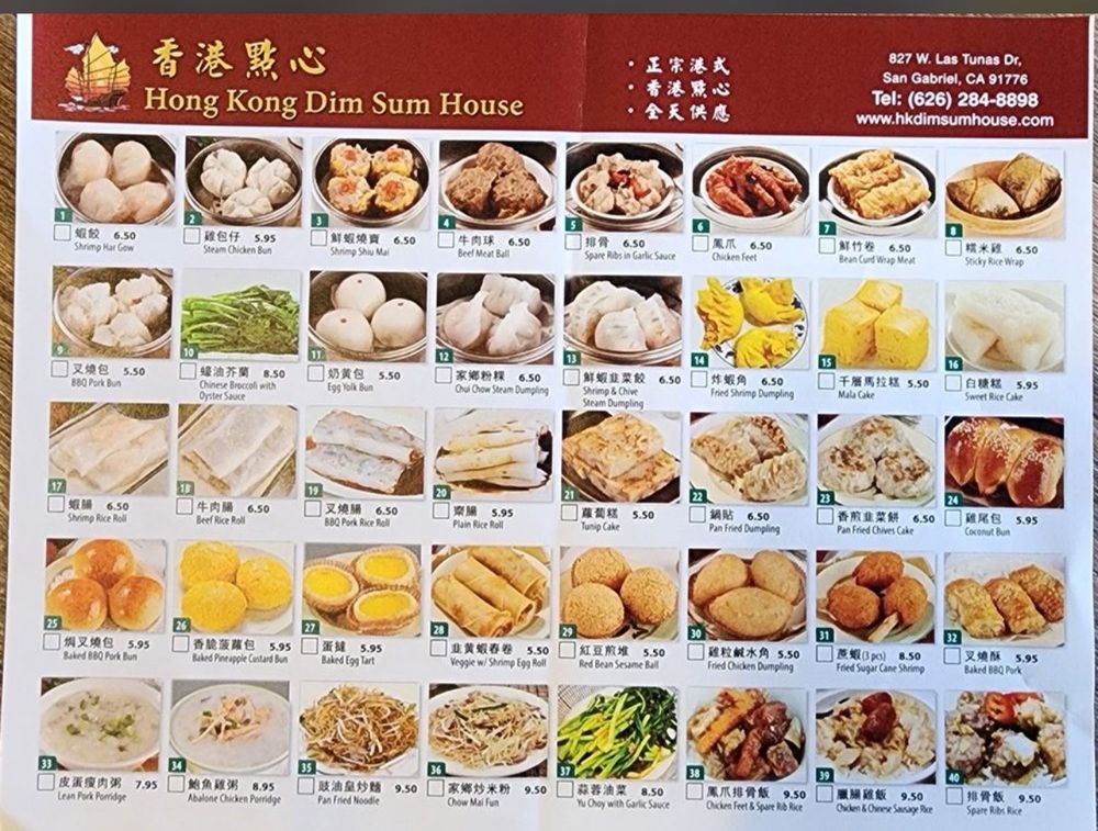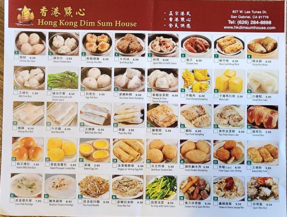 Introducing the menu at Hong Kong Dim Sum House, a cozy gem in San Gabriel, CA, specializing in authentic dim sum cuisine. The extensive menu includes traditional favorites like Shrimp Har Gow, Spare Ribs in Garlic Sauce, and BBQ Pork Buns, catering to both meat lovers and vegetarians. Customers rave about the delicious offerings, such as the plump and meaty dumplings, flavorful porridge, and juicy Shumai. The restaurant is clean, up to code, and offers friendly service, creating a welcoming atmosphere for diners. With limited seating, quick service, and the option for takeout, Hong Kong Dim Sum House provides a fantastic dining experience for dim sum enthusiasts. Don't miss out on this hole-in-the-wall spot that delivers quality dishes at great value. So, if you're in the mood for some delightful dim sum, make sure to visit Hong Kong Dim Sum House soon!